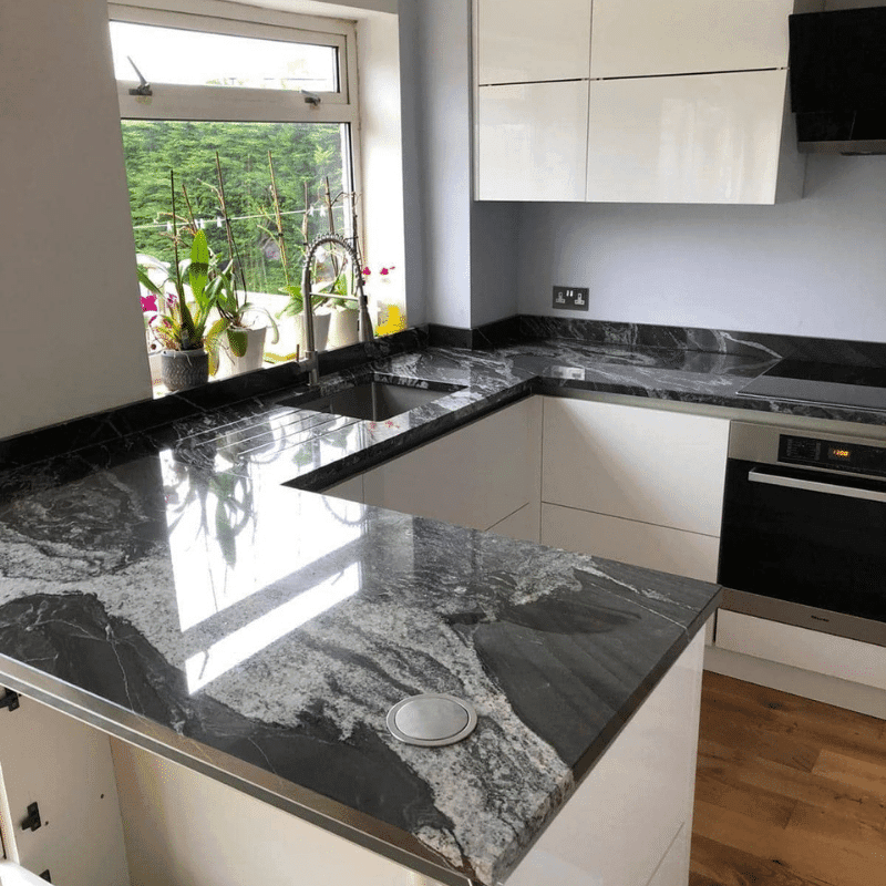 If you’re looking for a striking stone worktop that includes additional bespoke features such as drainboards, custom edging, or even an island to match, we can make it happen.